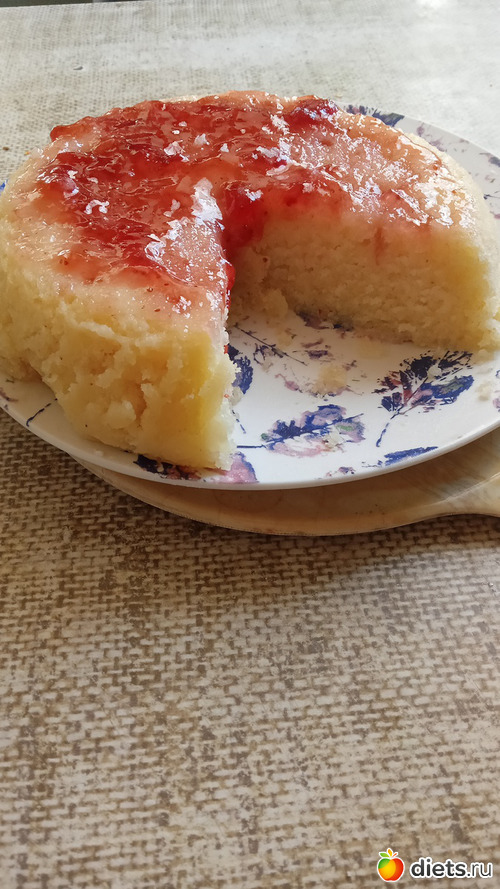 Приготовила,только пришлось готовить 10 минут.Украсила вишнёвым джемом.Вкусно,мягко,съела часть,а завтра кровь на сахар сдавать!