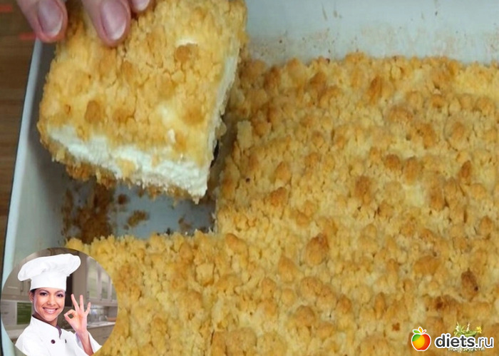 Чтобы приготовить начинку, я взбиваю яйца, добавляю творожок и сахар. Все это необходимо перемешать и взбить. Форму или сковороду намазать маслом, выложить 1/2 часть теста, на него - начинку и сверху насыпать оставшиеся крошки теста. Разогреть духовку заранее, поставить туда пирог и выпекать около 40 минут.
