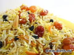 Рис нужно сварить в подсоленной воде до полуготовности, и потом добавить в него вымытый изюм. Курагу, финики, чернослив нужно нарезать соломкой и тоже добавить в рис. Ядра грецких орехов истолочь и немного обжарить, после чего тоже добавить в рис. Все нужно перемешать, закрыть крышкой и на небольшом огне довести до готовности. В готовое блюдо добавить мед, хорошо перемешать и дать немного настояться.
