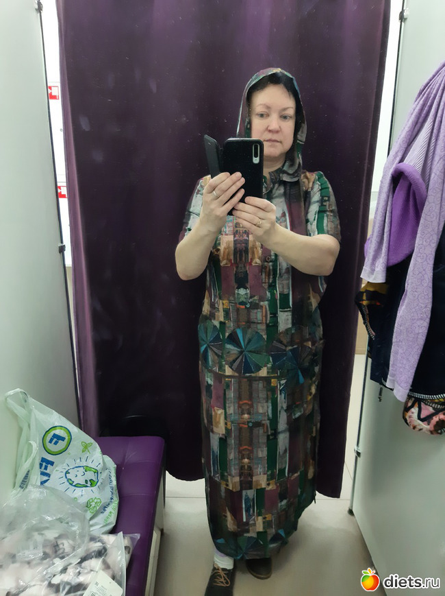 А из примеренных платьев мне больше всего на тебе понравилось "Зулейха, открывшая глаза". Рисунок реально стройнит и маскирует животик. Капюшон, правда, мне не очень.