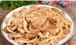 8. Маринованную свинину открываем, кусочки с луком перекладываем на тарелку.