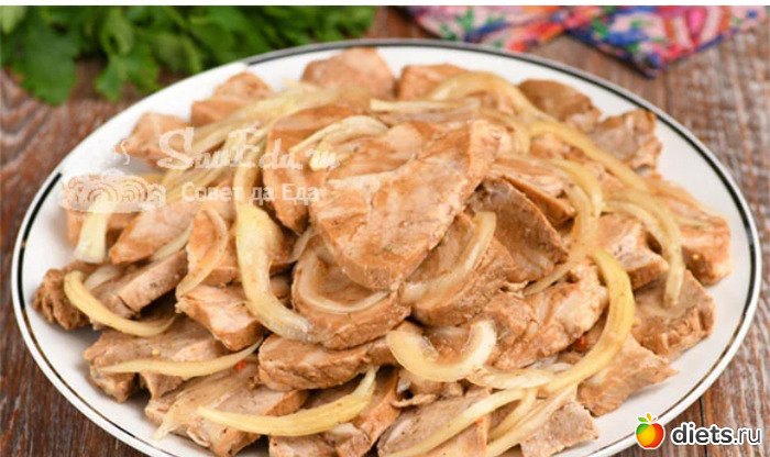 5. Вареную свинину нарезаем на не очень тонкие кусочки и 1/3 часть размещаем на луке.