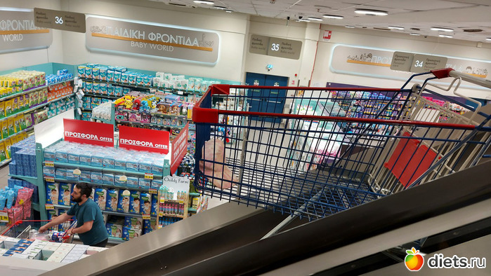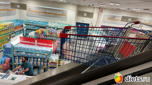 Первая точка - крупный супермаркет. Расположился он на двух этажах. Отдельный сотрудник спускает и поднимает коляски с продуктами по специальному эскалатору. Нигде ранее такого не видели
