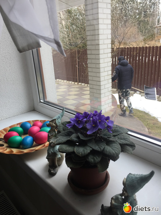 Муж и сын так отлично прибрали весь участок, сожгли собранные ветки, пожарили мясо на гриле (теперь жарим его на газовом). К мясу традиционный картофельный салат разные овощи и соленая капуста. Традиционными пасхальными блюдами у нас никто не увлекается но немного яиц для порядку покрасила и кулич купила (втридорога и суховатый)