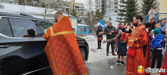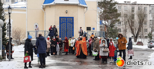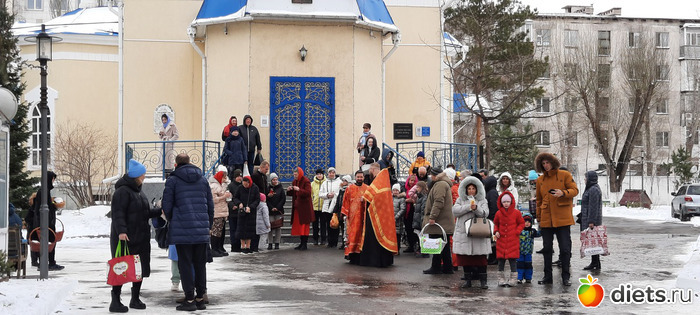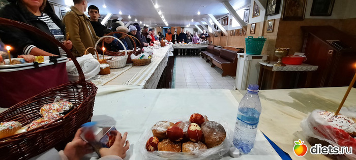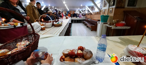 Там, конечно же, очень много народу. Освящение происходит внтури в дополнительном зале, потому что на улице холодно. Я так удачно попала, как раз встала у столика и вышли освящать. Всё моё окропили и хорошо так, потому что, когда батюшки уходили, я сказала: А нас ещё? И на меня каак брызнули и на мои куличи и на мои крашенки-яйца.