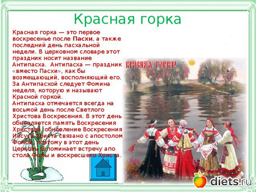 В народе первое воскресенье после Пасхи также называют Красной горкой. К этому времени сходит снег, пробуждается природа. И самые высокие точки земли – пригорки – покрываются молодой травой и цветами. Становятся «красными», то есть красивыми.