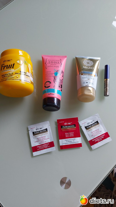 Заказ белорусской косметики: 2 маски для волос доче (покупки и расход косметики членов семьи я не в ключаю в отчет, просто на фото попало), себе - антицеллюлитный крем, жидкая подводка цвета хаки. 3 пробника положили в подарок