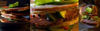 Разложить слоями вафельный хлеб, ломтики мясного карбоната и дольки огурцов. Полить соусом из лимона и оливкового масла, добавить зелень, порезанный кольцами перец чили.