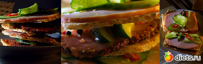 Разложить слоями вафельный хлеб, ломтики мясного карбоната и дольки огурцов... Читать полностью