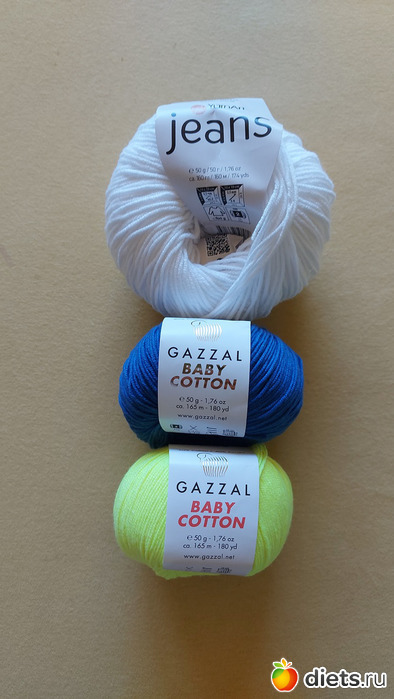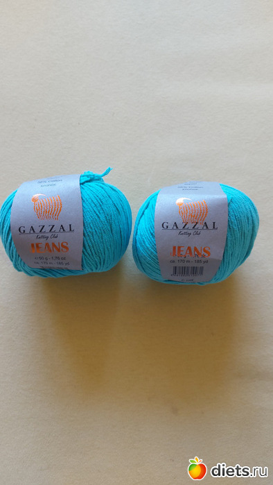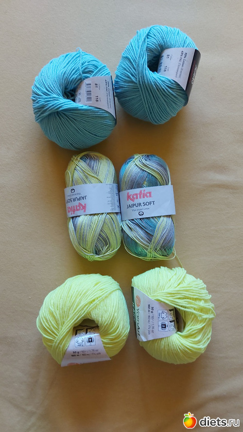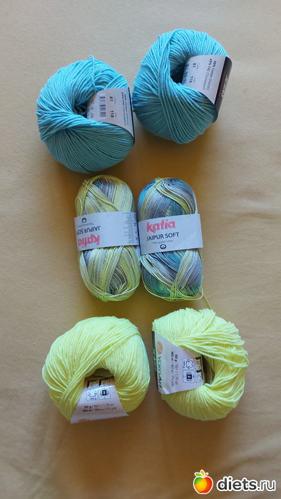 Один из вариантов задумывался как подмот к такой вот слишком тонкой пряже от Кatia, не могла выбрать, салатовые или голубые, решила взять оба цвета и вязать полосками
