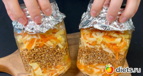 3. Раскладываем по банкам сначала овощи (половину от общего объёма), затем всю гречку и завершающим слоем закладываем вторую половину овощей.
