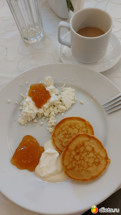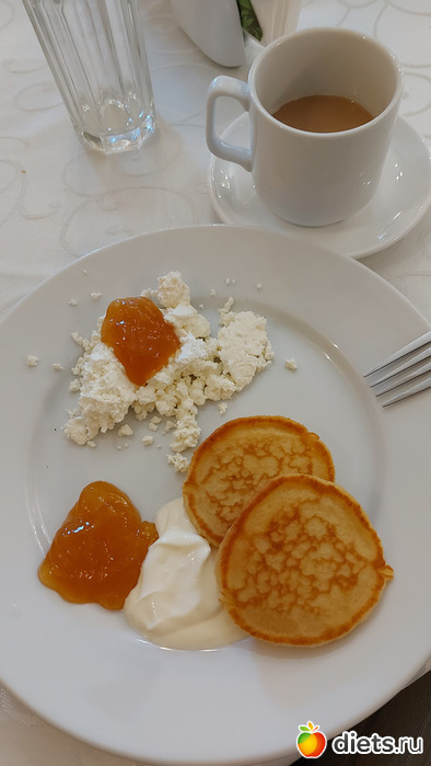 Заход номер два - творог, варенье, блинчики, сметана, кофе