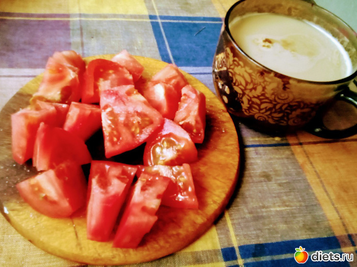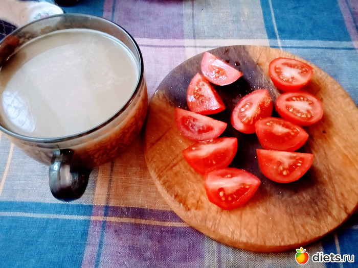 в 9 утра съела один большой помидор с солью и кофе с молоком, на обед в 14.30 съела ещё 3 маленьких помидора и выпила чай для похудения Тростинка называется, всё это время пила кофе с молоком, я прям не могу остановиться очень много пью воды, знаю что это плохо, но выпиваю больше нормы аж по 5л а то может и больше и это очень плохо, нужно менять своё рвение и желание много пить...