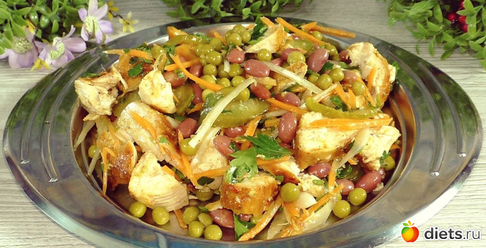 Сытное, питательное и полезное блюдо. Салат с фасолью и куриным филе — если использовать свежую фасоль, то на приготовления блюда уйдёт немного больше времени. Если надо приготовить салат на скорую руку-то беру магазинную консервированную фасоль.