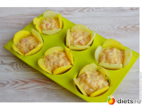 В формочку для выпечки кексов (у меня силиконовая) выложить картофельные кружочки (по бокам и на дно).