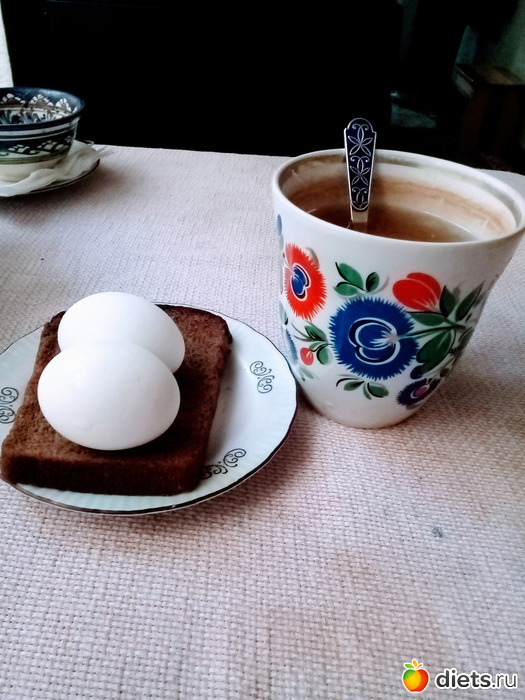 Завтрак: 2 яйца всмятку и чай зелёный или черный или кофе с молоком всё без сахара;