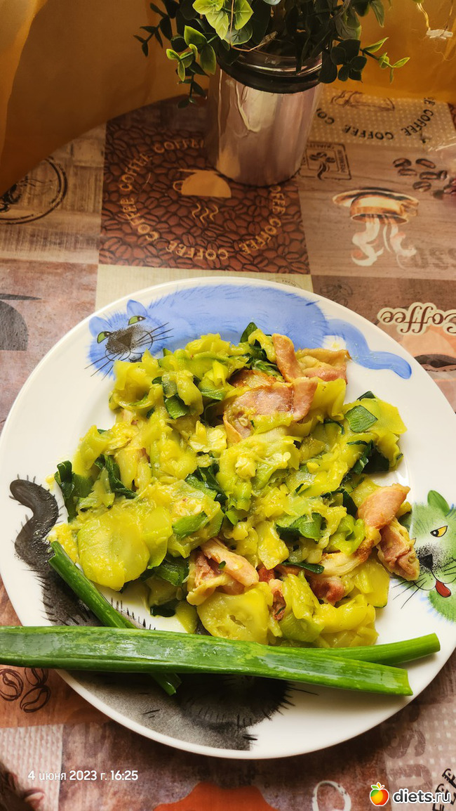 • цуккини с беконом, зелёный лук. Стаканчик кефира