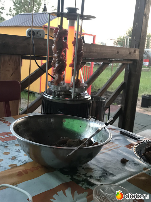 жарили мяско на электрошашлычнице и сразу его ели. Вкусненько. На запах сосед прибежал с "Лимончелло" собственного производства. Даже баню не топили, обошлись летним душем.