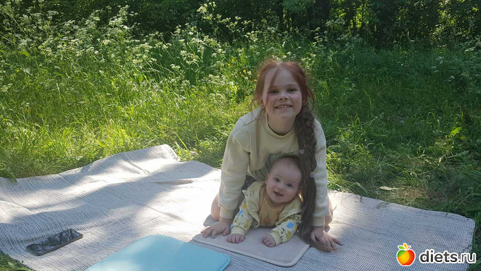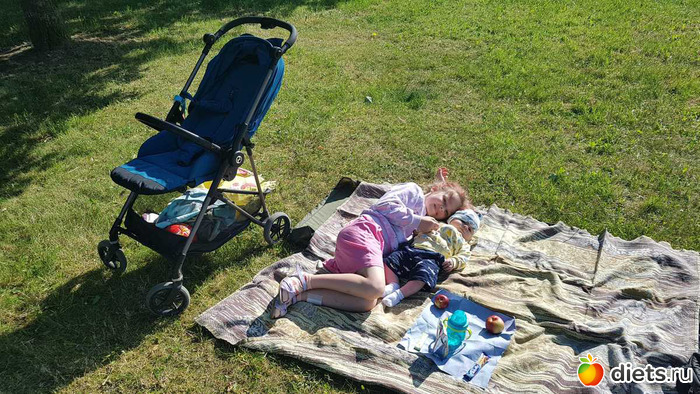 Под вечер мы с сыном - на пробежку, а муж двух младших детей вывез в парк. Ленится он гулять с коляской, так просто дотолкал ее 10 метров от подьезда до входа в парк, и там они устроили "пикник"