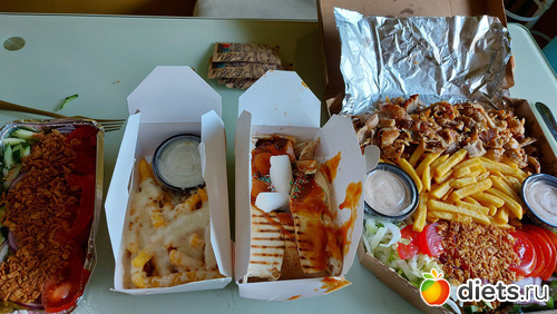 Мне - голландский капсалон, доче - фри с сыром и сладкую шаурму, мужу и сыну напополам - "семейная закусочная тарелка"