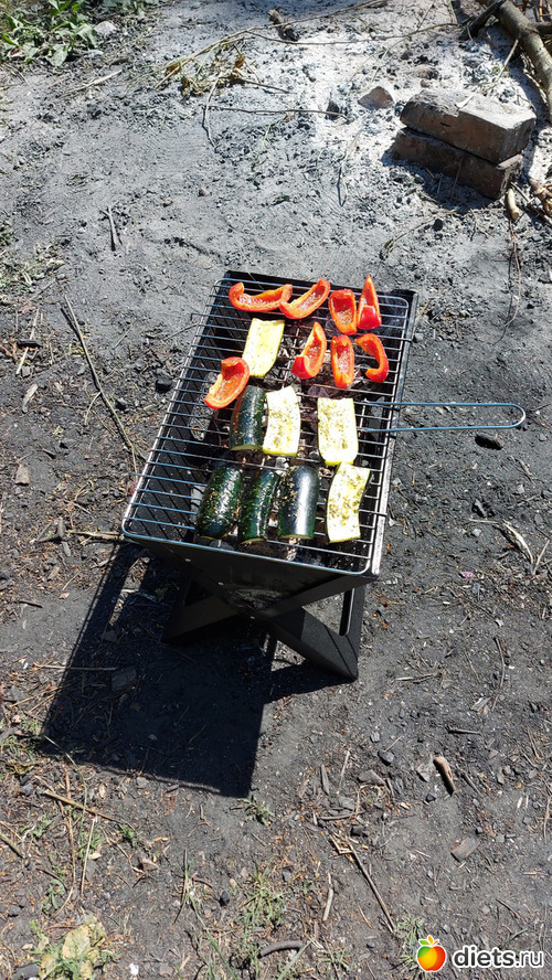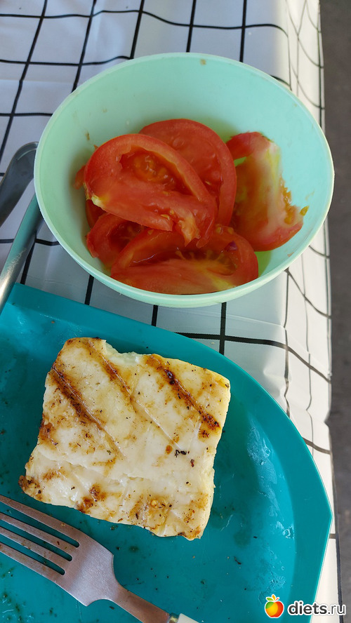 Обед: индюшачья нога, баклажаны, цукини, перец, свежие овощи, халлуми