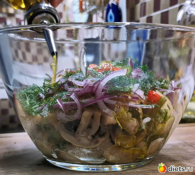 Перед подачей на стол заправляем грибы по своему вкусу. Можно только растительным маслом. А можно и поинтереснее. Например, тонко нарезать репчатый лук, измельчить укропчик и добавить немного свежего острого перчика Чили.