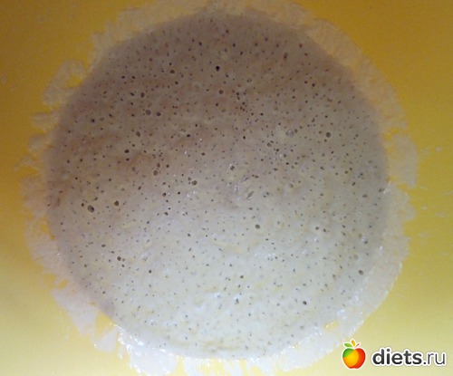 # Оставить в закрытой посуде на 8-16 часов в прохладном месте (около 10°). В тепле брожении идёт быстрее. Смотрите, как только опара увеличилась раз в 6, образует большие пузыри и отдаёт алкоголем - она готова.