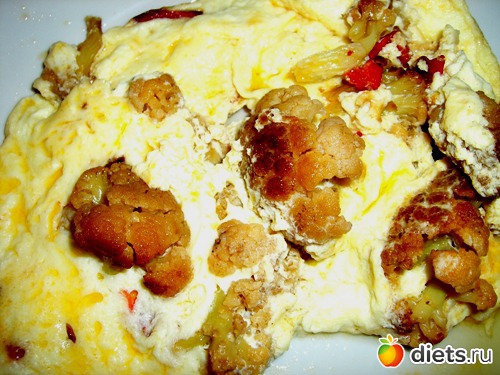 Отварить в подсоленной воде цветную капусту. Разделить на соцветия, сложить в сковороду, на дно налить немного растительного масла и сверху залить омлетом. Запекать можно в духовке или на печке.