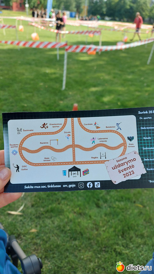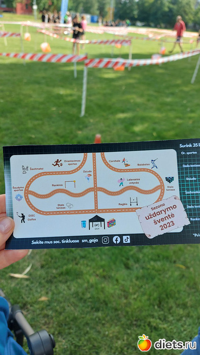На входе нам дали такую карту. Предложили попробовать 11 видов спорта, в каждом пройти какие-то испытания, и в зависимости от успешности получить наклейки - от 1 до 5. Набрав 35 наклеек можно было получить приз. Виды спорта предлагалось освоить такие: ориентационный забег, настольный теннис, дзюдо, шахматы, гандбол, cornhole (?), борьбу, регби, дискогольф, стрельбу, бейсбол