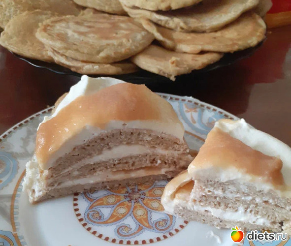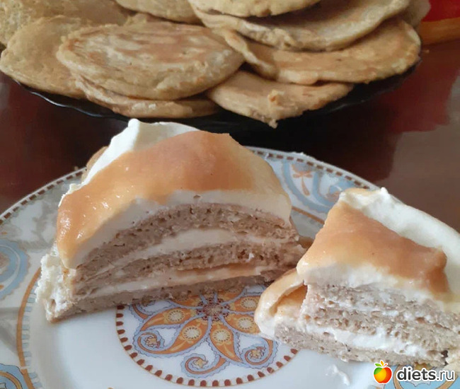 Далее сооружаем «пирожное» или тортик, выкладывая на блинчик творожную смесь, поверх смеси – яблочное пюре без сахара, и накрываем следующим блинчиком.
