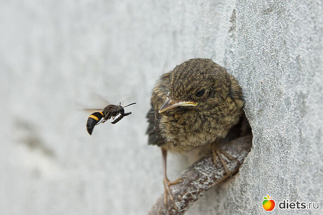 Оказалось, оса приносила зернышки слепой птичке, сидевшей неподалеку на дереве, и эта птичка аккуратно склевывала их.