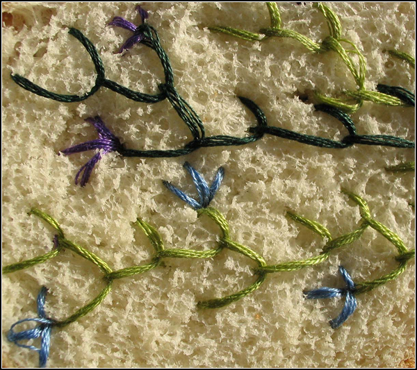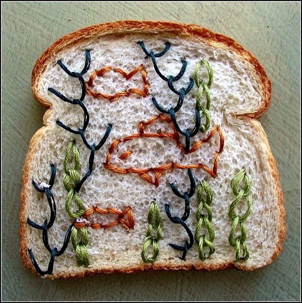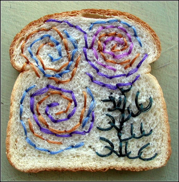 Разноцветные нитки и толстая игла, а также пара буханок нарезного хлеба, а также минутка вдохновения приводят к тому, что хлеб превращается в полотна для незатейливых вышитых картинок. Будь то цветочные орнаменты, либо же фрагменты известных картин, а то и мимолетная фантазия в виде неба, моря, облаков, или же рыбок меж водорослей.