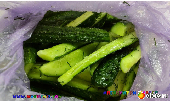 Нарезаем огурцы и складываем их в пакет. Просто разрезаем на четыре части вдоль огурца. Если они слишком длинные, можно сначала разрезать по длине пополам. У меня огурчики коротенькие.