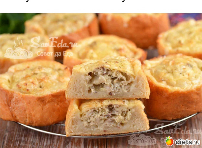 10. Вот так они выглядят в разрезе. Багет за счет молока не превращается в сухарь, получается с нежным хрустом. Внутри сочная и вкусная рыбная начинка, сыр дает отличный сливочный вкус. Это очень вкусно.
