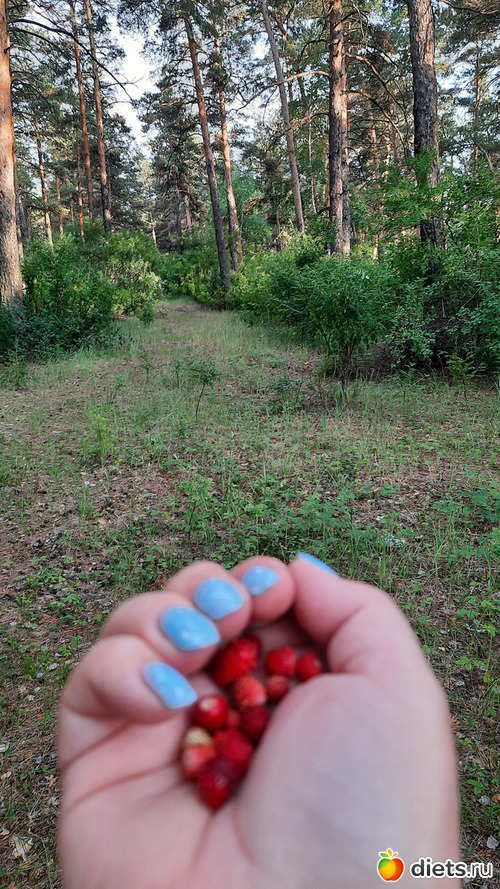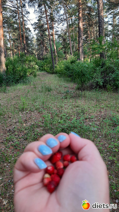 На вечер мы расстались. Всё-таки она приехала на 1 сутки и ей нужно было уединение. Я тоже подустала. Она чего-то там всё училась. А я вечером гуляла по лесу. Собирала и ела с куста землянику.