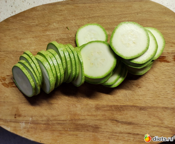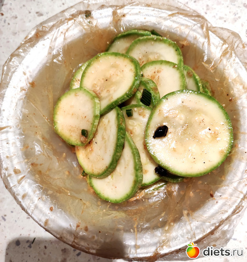 Режем кабачок кружочками толщиной 3-4 мм (блогер не указала толщину, но мне показалось, что нужно резать чуть тоньше, чтобы быстрее промариновался).