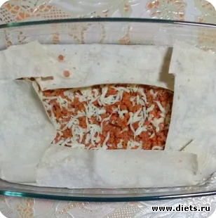 Накрыть лавашом и повторить так несколько раз, у меня из этого количества ингредиентов получилось 3 слоя.
