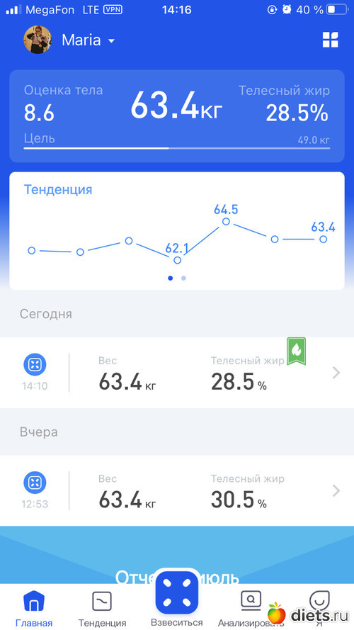 На сегодняшнее утро, понедельник вес стал 85.5 кг
