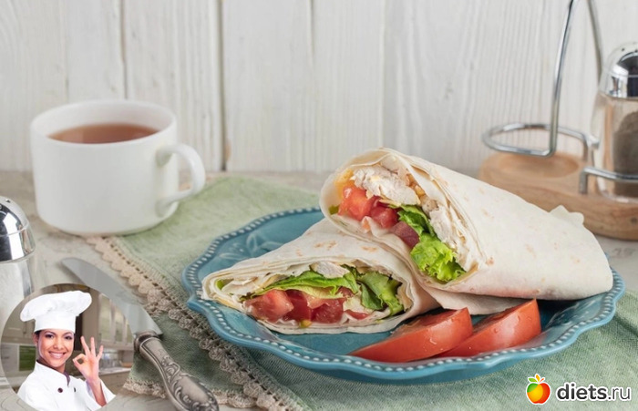 5. На лист лаваша тонким слоем положить половину начинки, салатные листья и помидоры. Свернуть все в рулет. Так же сформировать второй лист лаваша.