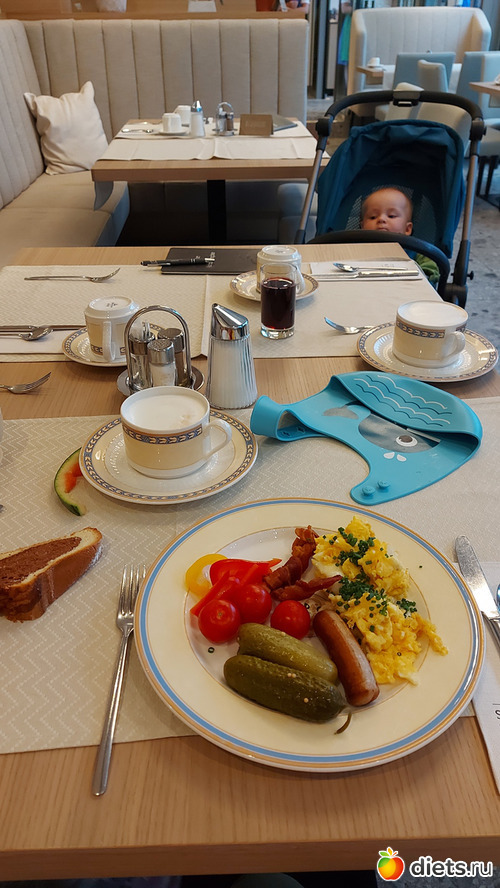 Первую тарелочку мне собрал муж, пока я кормила малыша (кашу малышу мы принесли свою) - омлет, сосиски, овощи. Бекон оставила
