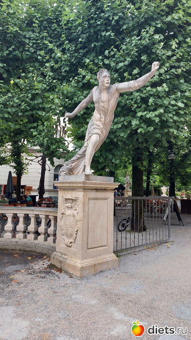 Фонтаны спрятаны в статуях и включаются в самое неожиданное время. Как я ни пыталась спасаться мелкими перебежками меж сухих пятачков, а все равно коварные струи меня настигли