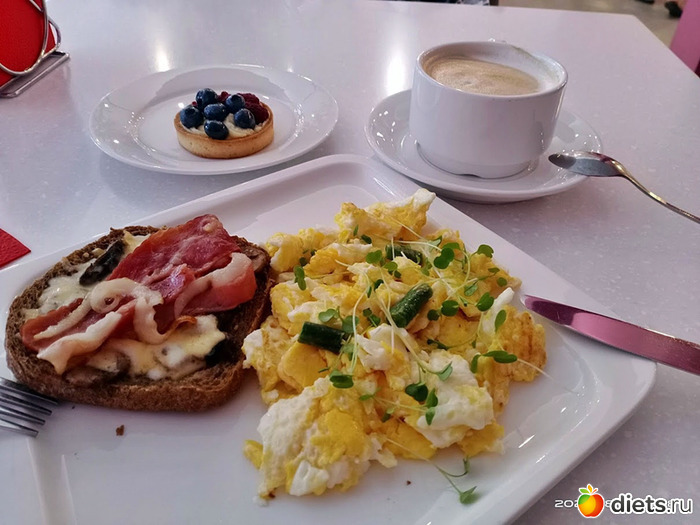 Завтрак был вот таким: скрембл из двух яиц, ломтик ржаного хлеба с обжаренными шампиньонами и беконом, чашка кофе и маленькое песочное пирожное с заварным кремом и свежими ягодами (тарталетка).