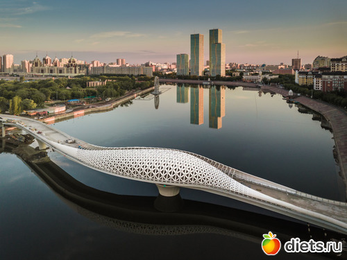 ой, а я не знаю, сколько мост км. (наверное-таки метров, он небольшой), объединяет два берега реки Есиль в парке.