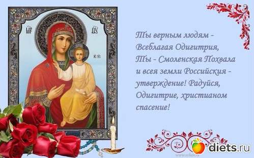 "Ты верным людям - Всеблагая Одигитрия, Ты - Смоленская Похвала и всея земли Российския - утверждение! Радуйся, Одигитрие, христианом спасение!"