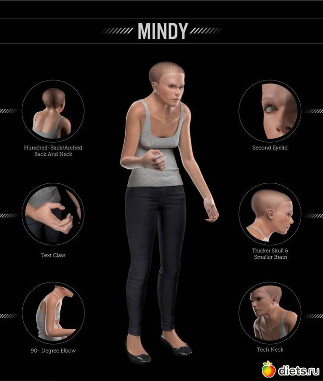 За увлечения гаджетами, включают более толстый череп и меньший мозг, а также появление второго века, которое защищало бы глаз от чрезмерного воздействия света.