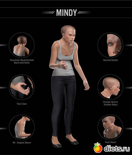 Гротескную модель назвали Минди. Она дает представление о том, как люди могут выглядеть в результате повальной зависимости от технологий.