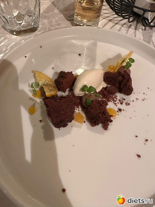 На обед сегодня давали суп, вероятно морковный, мясной рулет, картофельные крокеты, стручковую фасоль со шпеком, вишневую панакоту. Больше всего понравилась фасоль