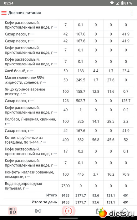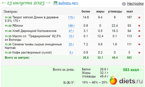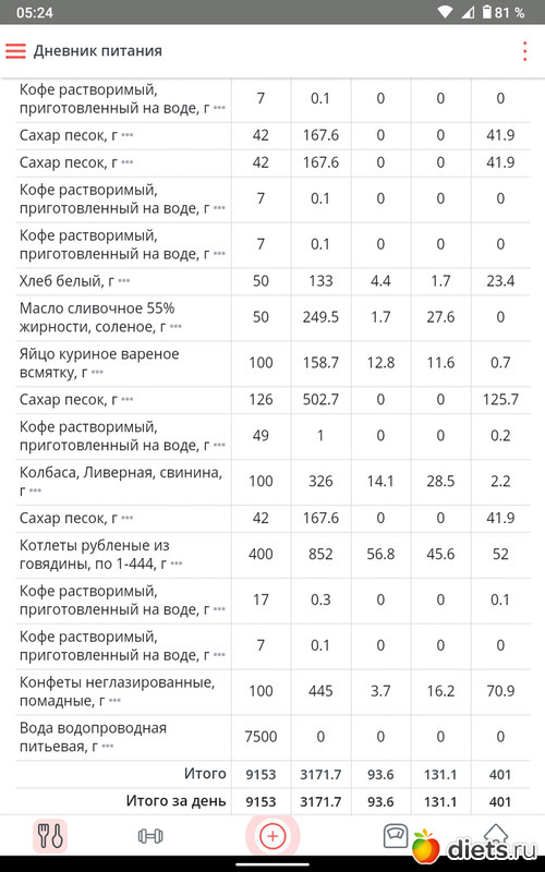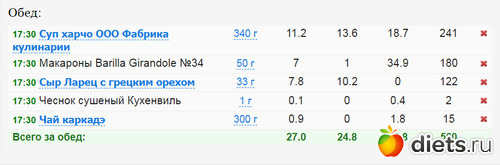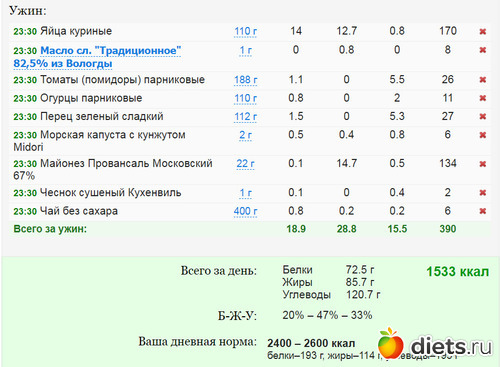Как видишь, еды за день достаточно при не очень большой калорийности. У меня не хватает белков, но я не могу есть много мяса (котлет особенно