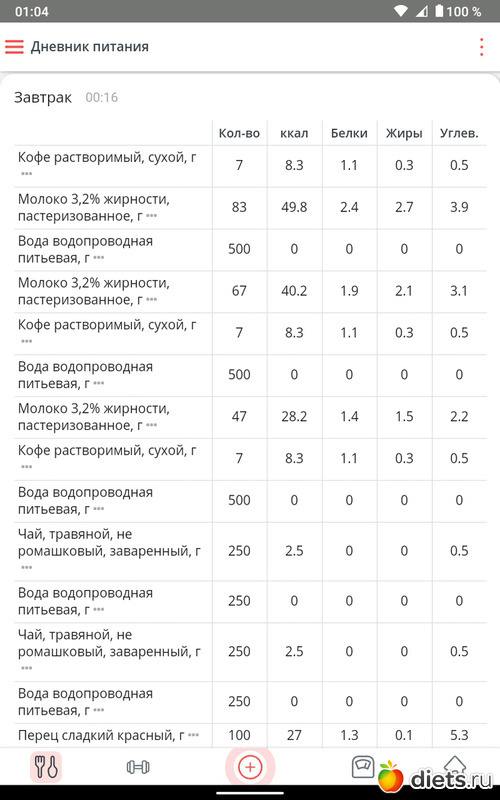 Съела я 385 г супа это на обед и 50 г куриной ножки, это был мой обед, на завтрак съела два фаршированных перца со сметаной, а на ужин съела 168 г кабачковые аладушек жаренных, вообщем норма по ккалл привысила на 300 ккалл, но несмотря на то, что я столько ела, вес стал снижаться и я безумно этому рада!!!