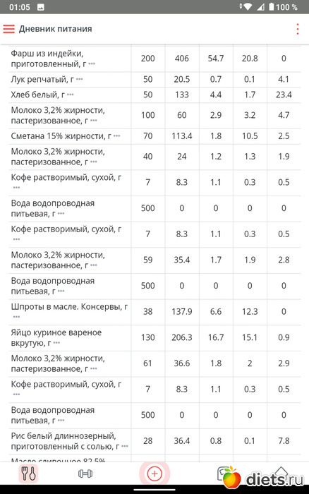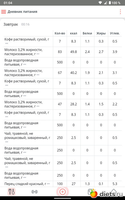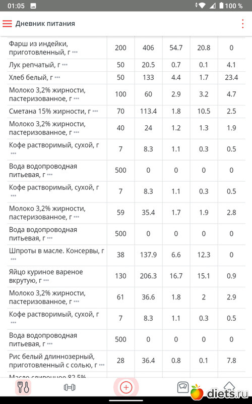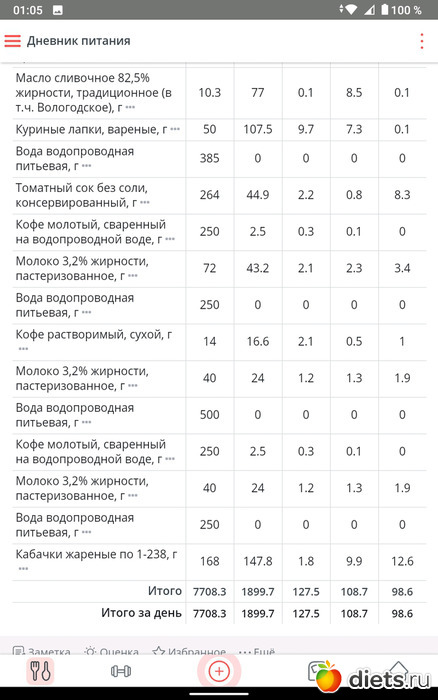Съела я 385 г супа это на обед и 50 г куриной ножки, это был мой обед, на завтрак съела два фаршированных перца со сметаной, а на ужин съела 168 г кабачковые аладушек жаренных, вообщем норма по ккалл привысила на 300 ккалл, но несмотря на то, что я столько ела, вес стал снижаться и я безумно этому рада!!!